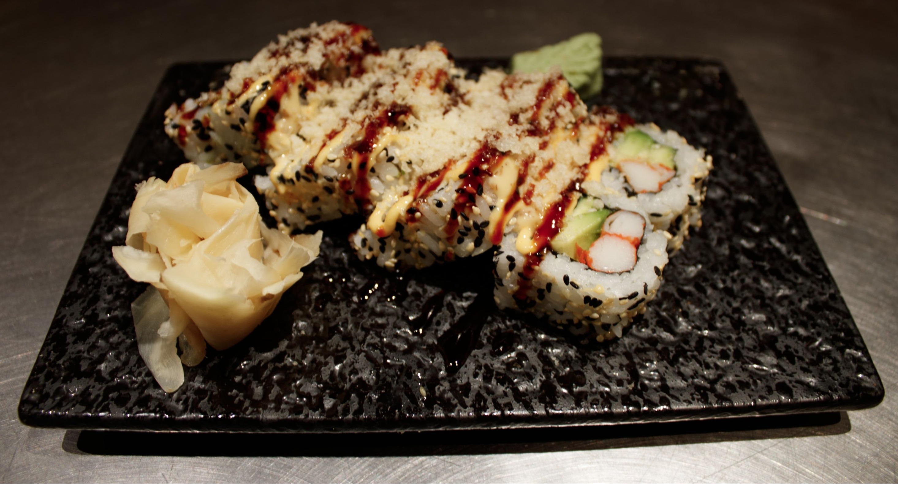 Kokt scampi, agurk, avokado, toppet med flambert laks, vårløk, philadelphia ost, teriyaki og chili majones. Boiled scampi, cucumber, avocado, with flambed salmon, scallions, teriyaki, philadelphia cheese, teriyaki & chili mayo on the top.Alergener: Fisk, sesamfrø, melk, hvetegluten